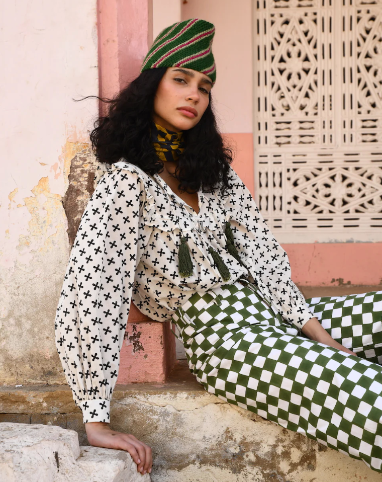 Cut from a crisp and unbleached Indian cotton poplin, the Clover Top is a block printed blouse to reach for again and again. She has voluminous, full length sleeves and an easy body for tucking in or draping out. The ruffle detail along the bib paired with hand made tassels add the perfect touch of femininity to this small batch style.